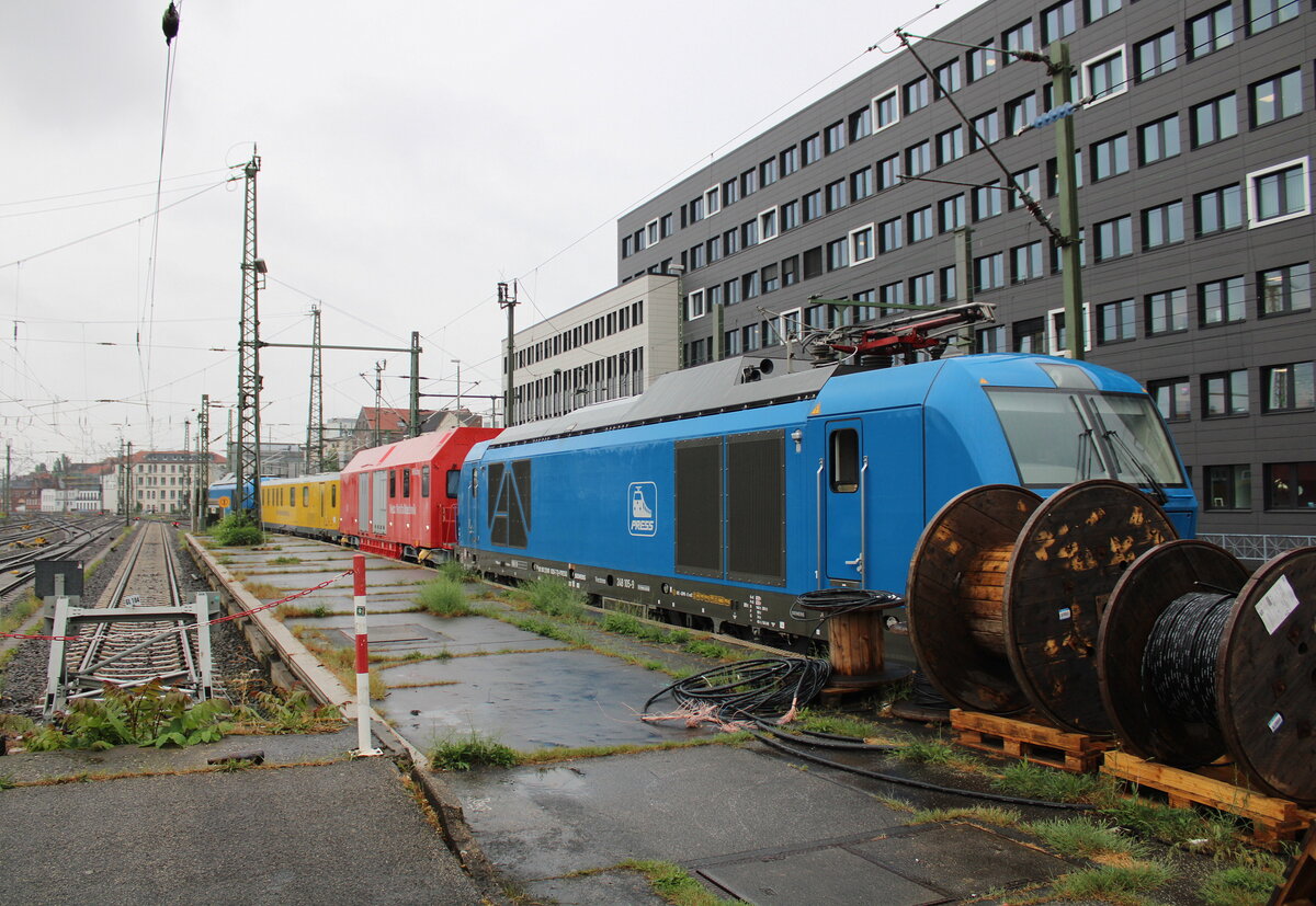 Am 15.05.2024 fuhr die EBS 202 597 zusammen mit der 202 738 und der 143 056 über die Unstrutbahn von Naumburg (S) Hbf nach Karsdorf.
