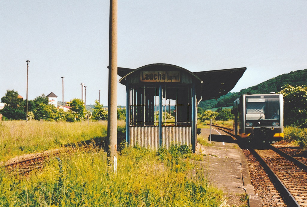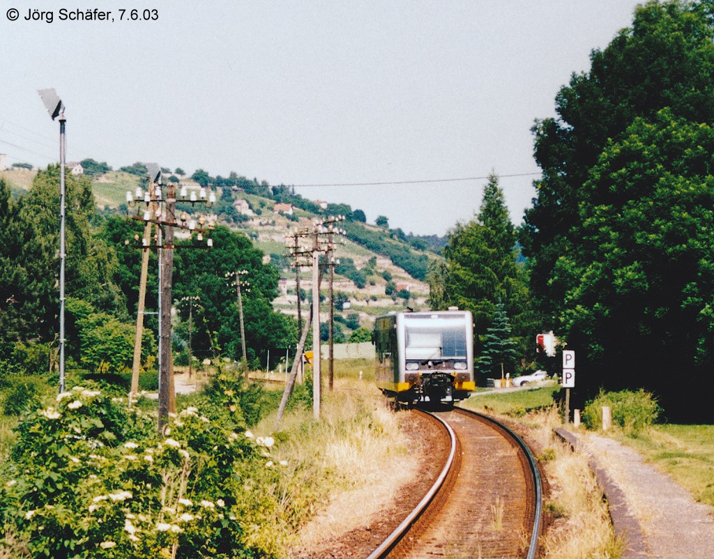 Ein VT 673 der KEG am 07.06.2003 als RB von Artern nach Naumburg Hbf, beim Halt in Gehofen. Die Ausmaße einiger Bahnhöfe zeugten von der Bedeutung der Strecke vor der "Wende". Am 7.6.03 war der Dienst für den Fahrdienstleiter in Gehofen aber langweilig: Nur noch für die etwa stündlich durchfahrenden Triebwagen musste er die Schranken des angrenzenden Bahnübergangs rauf- und runterkurbeln. (Foto: Jörg Schäfer) Frank Thomas